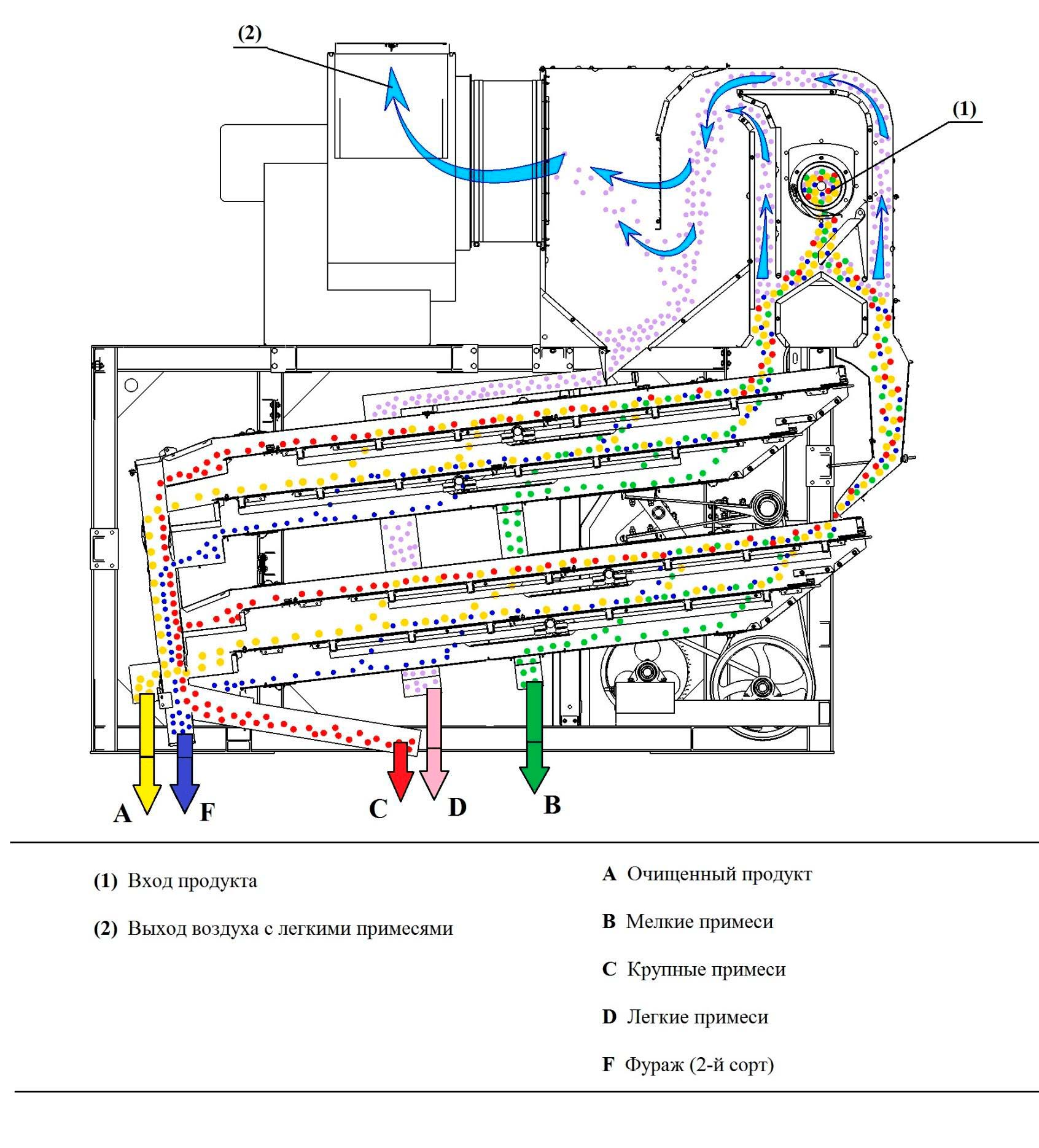 - Камеру для приема вороха — оборудована шнеком для распределения культур, клапаном и делителем для регулировки потока, каналом (аспирационным) для отвода легких примесей и отсеком для хранения вороха.